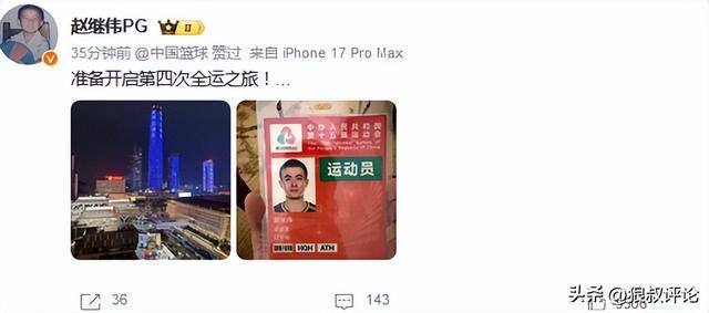 北京时间11月1日,辽宁男篮球员赵继伟更新社媒发文:“准备开启第四次全运之旅”。